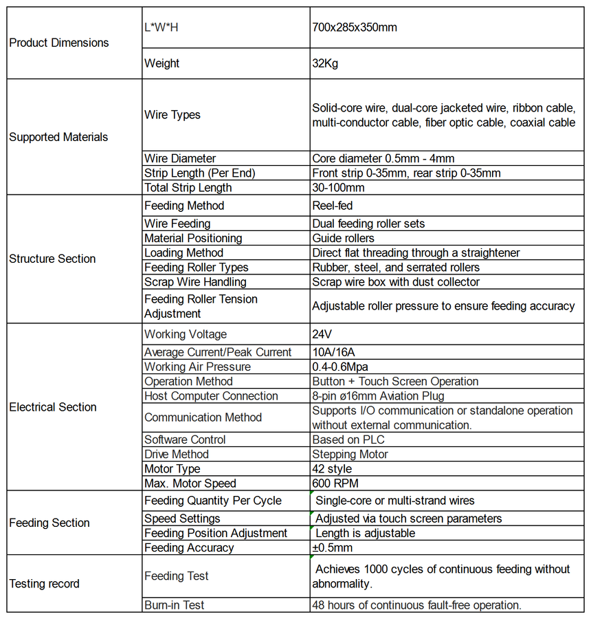 Functional Features 1. Strips single-core wires and feeds them to a robotic arm for automated welding, which enhances welding quality. 2. Strips single-core wires and supplies them to special-shaped insertion machines, enabling automated wire insertion and improving assembly efficiency. 3. Supports both in-line and off-line operation modes. This multi-purpose functionality reduces the need for repeated equipment purchases. 4. Can be integrated with custom automation equipment to perform automated feeding of wires and jumpers, as well as stripping and cutting of various reel-based cables. |